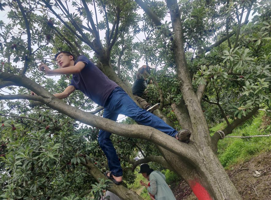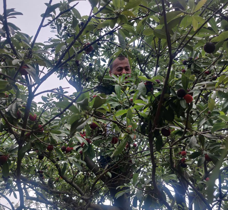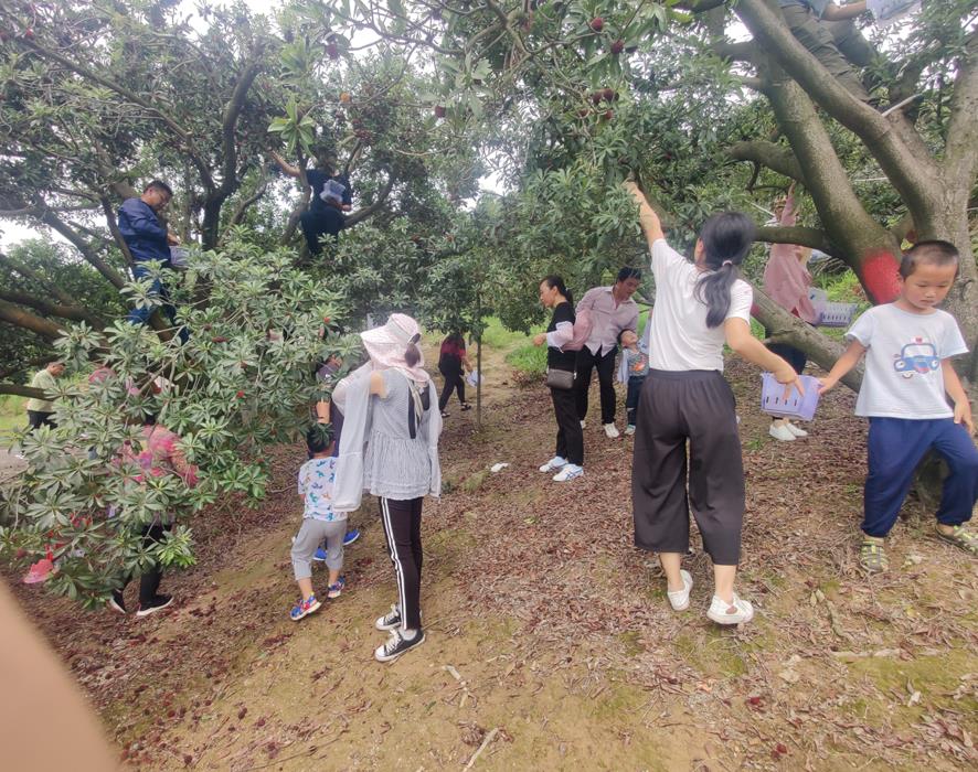 我們在山腳下停好車,看到陸陸續(xù)續(xù)從山里走下來的人群,他們也應(yīng)是從城里來體驗(yàn)采摘生活的,大人小孩都提著或多或少剛剛采摘好、顏色紅艷的新鮮楊梅,誘得我們這些大人小孩的口水直溢。