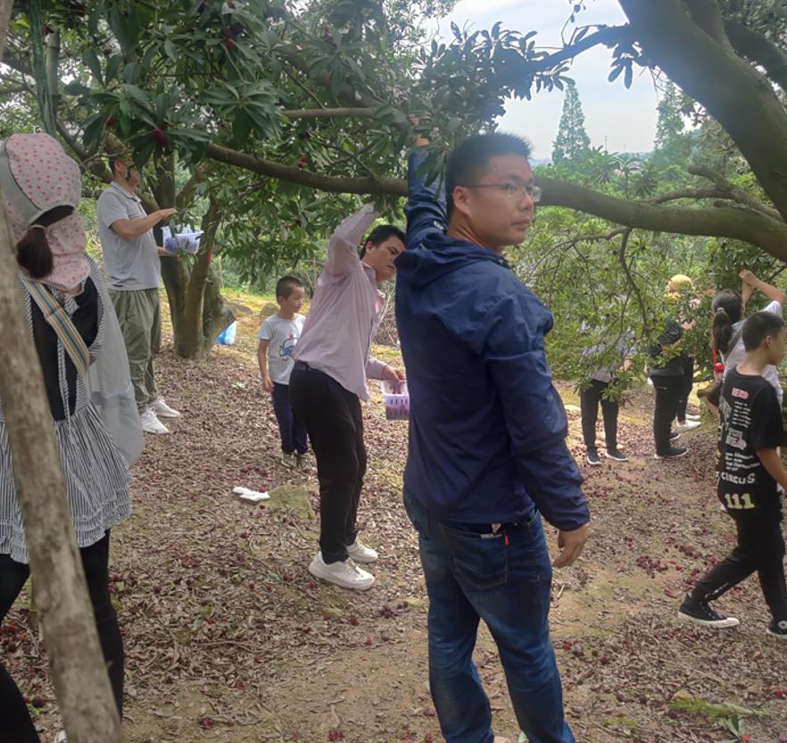 沒過多久,我們就來到了楊梅基地,看見了陽光下的楊梅,鮮紅的、淡紅的、青色的掛滿了枝頭。想起一首楊梅的詩:“五月楊梅已滿林,初疑一顆值千金。味勝河溯葡萄重,色比瀘南荔枝深”。于是,我們?nèi)滩蛔√裟鞘焱傅挠执笥旨t的摘下來放進(jìn)了嘴巴,一口咬下去甜津津中透著酸。我們就從平坦的山腳下,一邊采、一邊吃。這時也不分大人小孩,個個都像不懂事的孩童,挑最好的摘一個吃一個,吃得滿嘴流淌著紅紅的楊梅汁。大伙吃得牙都酸了,孩子們也玩累了,有同事就提議照些相片做個紀(jì)念。于是一個個擺著摘楊梅、吃楊梅、炫楊梅的表情和動作在小小相機(jī)里面留下了快樂的時光。這時已臨近下午1點(diǎn),太陽當(dāng)空照,雖然很熱,但大家都忘乎所以,一切都回到了孩提時代。喧鬧聲、歡笑聲回蕩在整個楊梅基地里。